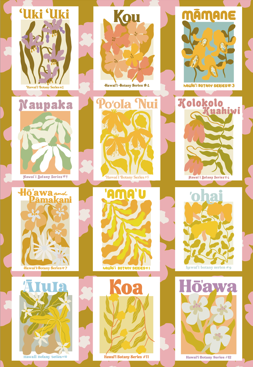 A beautiful collage of Aida's prints of Native Hawaiian plants, showcasing the beauty and diversity of our island flora in a unique way.